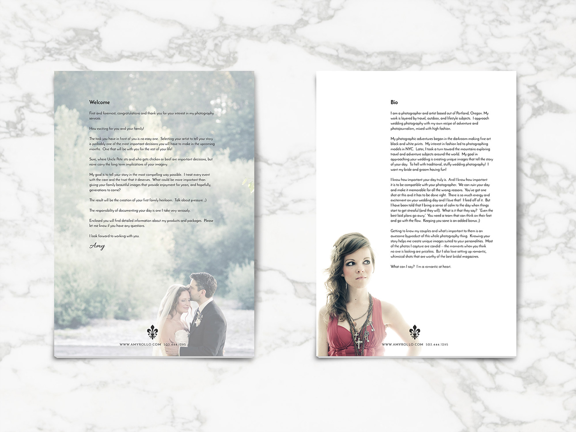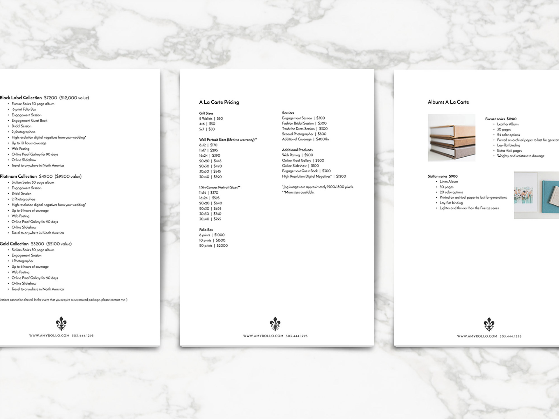 This is a PDF document I created for Wedding Photography clients. I receive several inquiries a year for Wedding Photography services. This document makes it easy for potential clients to see an overview of my services and what they cost.